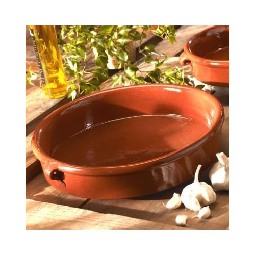 A very versatile size cazuela -- you might use it to make a small paella, or similar rice dish. Cazuelas, terra cotta dishes, have been used in Spain for literally thousands of years. Our cazuelas are unique in that they are made by potters who follow a Roman formula that has been employed for centuries in this area of Spain. Although terra cotta is nothing more complicated than moistened clay, low fired with an interior glaze so it can hold liquids, this particular technique that they follow involves including small pebbles in the mix which strengthens the bowl and increases its heat retention. La Tienda is the only source for this high quality cazuela in America. The glaze on the cazuela is perfectly safe for all applications -- it contains no lead. We provide directions for a simple seasoning (essentially soaking in water for a few hours) which renders the cazuela good for stovetop, oven or microwave. When cooking with terra cotta, the key is to increase heat gradually.