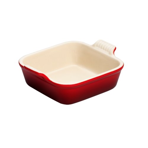 Le Creuset Bakeware: Le Creuset Heritage Stoneware 5" Square Dish, Cherry From indulgent desserts and hearty casseroles to freshly baked breads and more, Le Creuset's assortment of quality bakeware ensures perfect results from the oven every time. Le Creuset stoneware dishes are versatile, multi-purpose designs that offer all the even-heating benefits of stoneware in a variety of shapes and capacities to fit nearly any baking, roasting or broiling recipe. Each dish features grooved handles for a sure grip, plus Le Creuset's glazed interior that protects against utensil damage, staining and odor absorption � making each dependable piece of stoneware easy to use and easy to count on. High-quality exterior enamel protects against metal marks and other damageHard-wearing, impermeable finish fired at temperatures as high as 2192 degrees F is safe for cutting on with knivesUnmatched thermal resistance from -65 degrees F to 500 degrees F � safe for the freezer, microwave, oven, broiler and dishwasherLess than 1% porosity, blocking moisture absorption which can lead to cracking, crazing and rippling along the interiorUnique clay mixture that creates a very dense material when fired, maintaining even temperatures and preventing scorchingResistant to staining and flavor/odor absorptionA perfectly color-matched palette of bold, consistent tones for easy mixing and matching with other Le Creuset products Introduction All items in the Le Creuset stoneware range are original designs and have been hand-crafted, making each piece unique. Due to this uniqueness, there may be slight variations from piece to piece. Le Creuset Stoneware is safe for use in the microwave, freezer, refrigerator, dishwasher, oven and broiler. The maximum oven-safe temperature is 500 degrees F / 260 degrees C. The enameled surface is easy to clean and scratch-resistant. The enamel is completely hygienic and will not absorb odors or flavors. Le Creuset Stoneware is extremely strong and durable, and resists staining, chipping and cracking. The handles, knobs and rims have been designed for a secure, easy-to-hold grip. Cleaning and Care DO NOT use any Stoneware piece on the stovetop or any other direct heat source. OVEN: Maximum oven-safe temperature is 500 degrees F / 260 degrees C. Use oven mitts for lifting at all times. BROILER: When using under a broiler allow a gap of no less than 2-1/2 inches between the rim of the dish and the heat source. MICROWAVE: Handles may become hot during prolonged microwave use, especially if the handles are enclosed with plastic wrap. Cover just the open top of the dish, leaving the handles exposed. FREEZER-TO-OVEN USE: Do not place a frozen dish of food in a preheated oven. Place the frozen dish in a cold oven and set the temperature, allowing the dish and oven to heat together. Before serving always check that the center of the food is completely and uniformly hot. CLEANING: Before the first use, wash the dish in hot, soapy water, and rinse and dry thoroughly. For most day-to-day cleaning, cool the dish for a few minutes before washing and drying, or wash in the dishwasher, allowing the full cycle to complete. Never leave a dish fully immersed in water. For removal of stubborn residues allow the dish to cool, fill with warm, soapy water and allow it to soak for 10 to 20 minutes. Wash in the usual way using a plastic brush or scouring pad if necessary. Cream Catalana