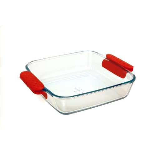 I had a corningware casserole I used for family style enchiladas for years until it broke. I have been searching for a replacement that four corn tortillas cover the bottom so I can layer the dish. This one exceeds my hopes. The silicone grip covers slip over the handles and allow good finger protection to remove the casserole from the oven. Just don't leave them on the hot glass or they get too hot to handle. I recommend this as a great shallow 4 quart baking dish! I'm sure I'll use it frequently.