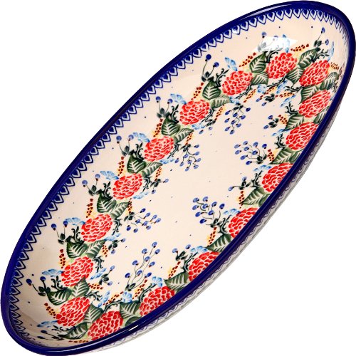 This Unikat Signature Polish Pottery is a Limited production from a small factory near Boleslawiec, Poland. The Model 0704 Pattern 280 created using Boleslawiec White Clay molded and painted by hand according to Traditional Methods with Styles of Design and Color influenced by Contemporary shapes and dyes. The beautiful Platter Karp has a Royal Blue rim accented by blue heart buds and 'Baron Girod de l'Ain' red roses. The exceptional rose is bright scarlet red with white edging to each petal tip. The rose accented by its lush leaves, tri-petal blossoms with scalloped leaves and clusters of blue buds dropping away from yellow and brown blossoms. The Platter created with a unique original design and formation of the mold followed by drying, pre-baking at 1562° Fahrenheit then Glazed, and fired at 2282° Fahrenheit is Scratch and Chip resistant, Lead free, Oven; Microwave; Dishwasher and Freezer safe without losing the beautiful colors and textures. The measurements in Inches are 1-3/4 high by 14-1/8 long by 8 7/8 wide. *Note; No machines used for Molding or Pattern stamping therefore there may be small variations in measurements and Patterns.