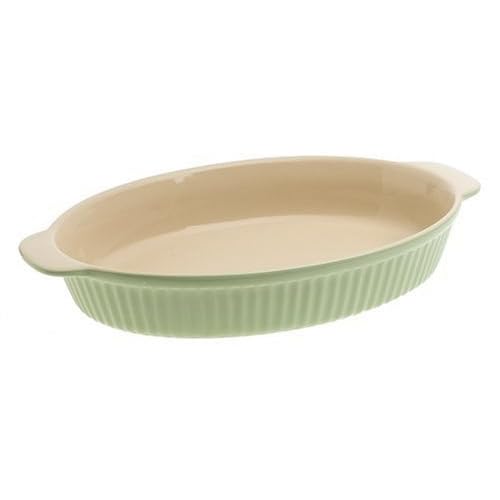 Typhoon's Vintage Kitchen collection brings a familiar, old-fashioned look to the kitchen and tabletop. Designed with classic ribbed sides, the oven-to-table bakeware displays a smooth interior in an almond tone that complements any of four exterior Vintage colors: baby blue, pale pink, pistachio green, and buttery cream. Matching the bakeware for a fully coordinated kitchen are canisters, jugs, mixing bowls, ramekins and more in the same pastel tones and vintage ribbed patterning. Made of durable stoneware that resists thermal shocks and breakage, this 16-by-8-by-3-inch oval baking dish evenly retains heat for cooking a roast, casserole, or gratin, and then serves beautifully at the table. A handle at either end enables lifting and carrying, and the glossy glaze helps prevent food from sticking. Safe also for microwave use, the baking dish cleans up conveniently in the dishwasher and is covered by a one-year warranty. Typhoon employs unusual colors, pop-art packaging, and retro styling to create products that enliven any kitchen and make terrific gifts. --Ann Bieri
