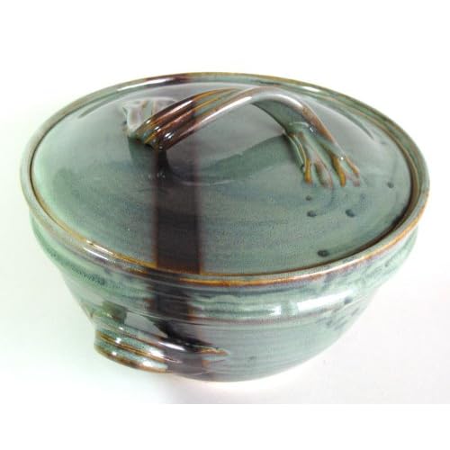 Hand-thrown stoneware covered casserole by New Mexico potter R. L. Rising of Las Cruces. Volume is equal to 2 quarts. Approximately 7 inches tall and 9 inches in diameter. The colour shown is called Ponderosa - turquoise green and dark brown. Oven safe, microwaveable, dishwasher safe, and lead free. Fired to 2400F., footed and signed 'Rising, Las Cruces'.